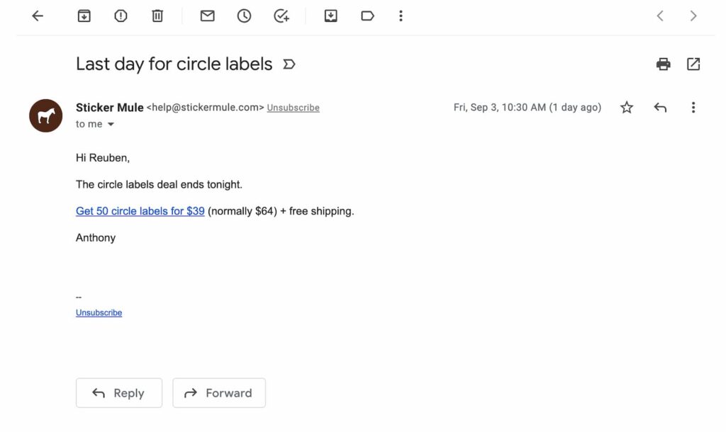 No one does this better than Sticker Mule. Not only do they have a great product but they also send simple and clear marketing emails. There’s a screenshot below but first answer these questions: