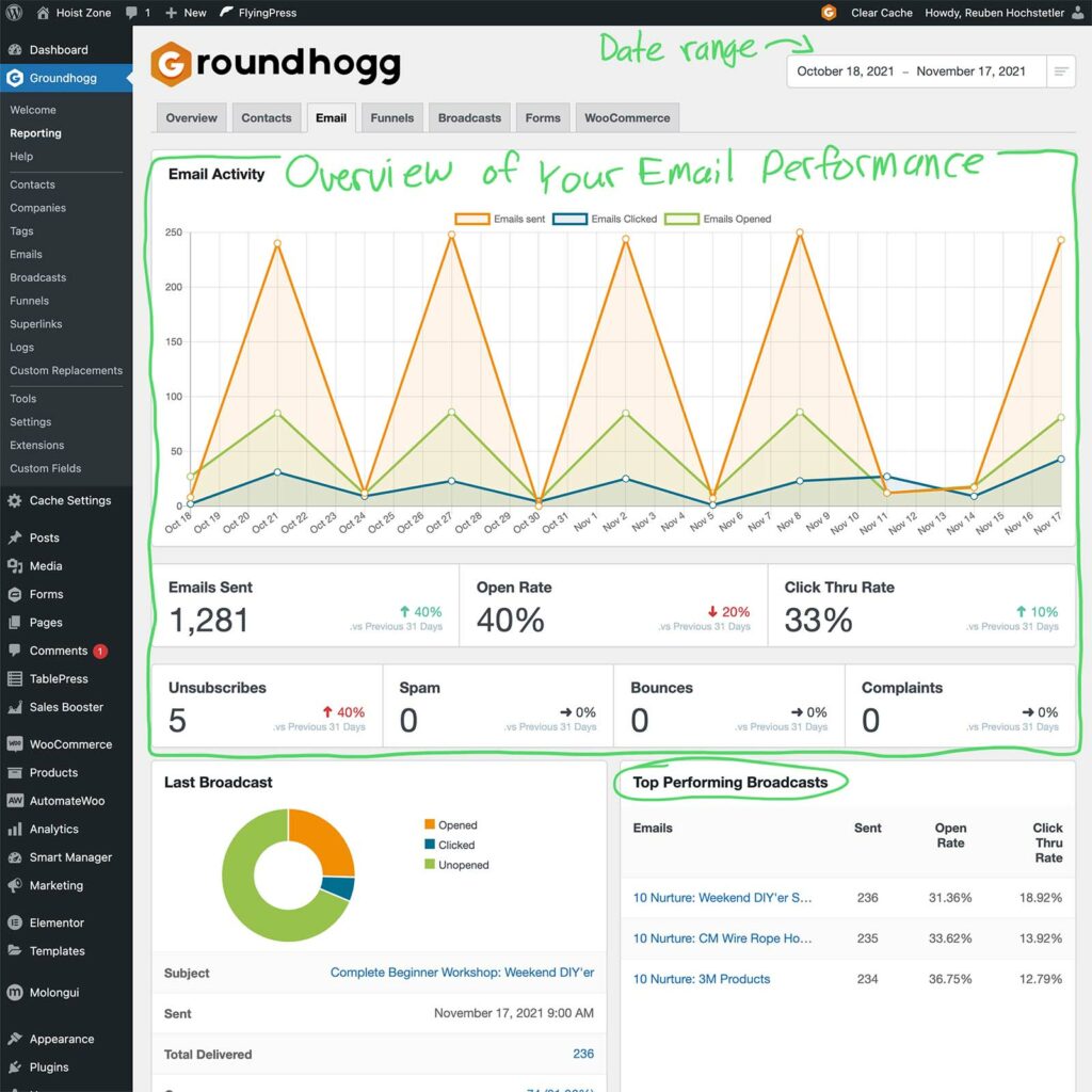 The second way to get stats about emails is to go to Groundhogg’s reporting dashboard. Under the Groundhogg menu, click on “Reporting”. Click on the “Broadcasts” tab.